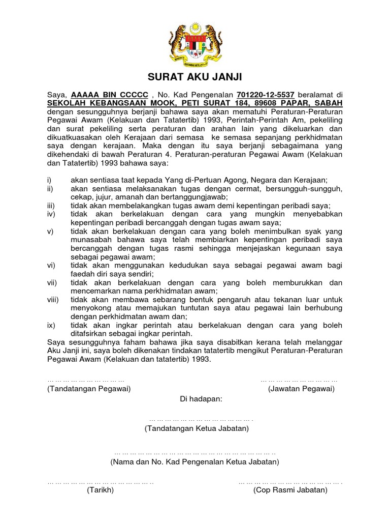 Dengan sesungguhnya berjanji bahawa saya akan mematuhi Peraturan-Peraturan Pegawai. 6 surat aku janji 1 1. Dengan sesungguhnya berjanji bahawa saya akan mematuhi Peraturan-Peraturan.