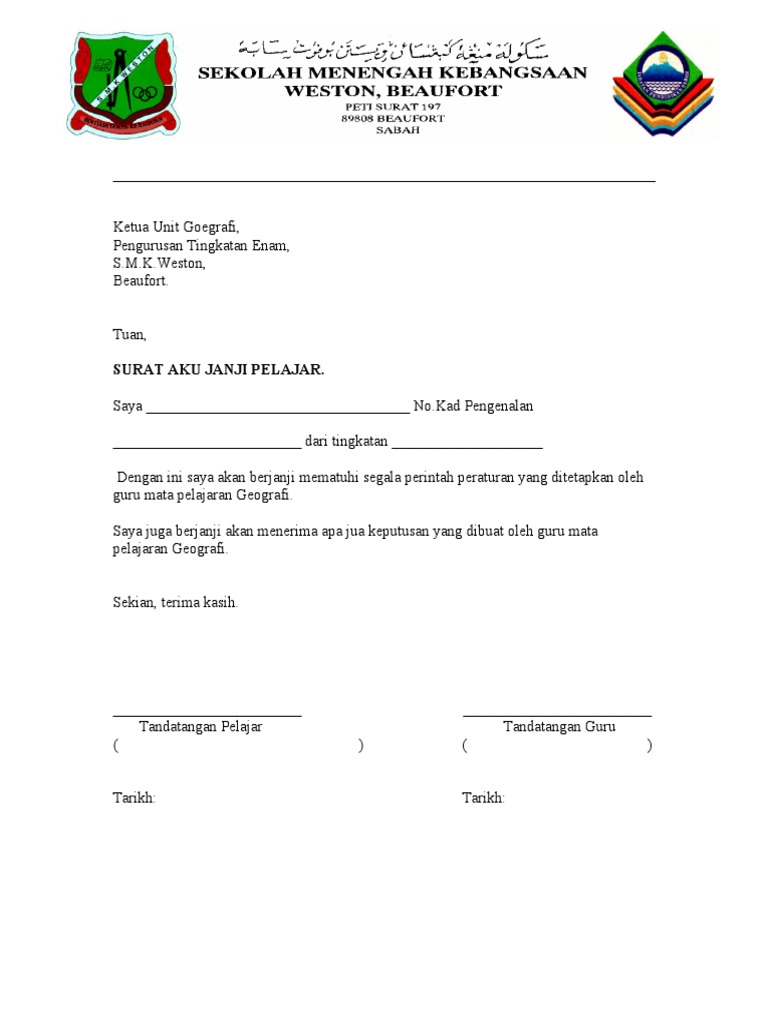 SURAT AKU JANJI MURID Diisi dalam 2 salinan iSalinan Ibu BapaPenjaga iiSalinan Pihak Sekolah NAMA MURID. Tanpa guru aku mungkin tidak. Surat aku janji adalah mengotakan ikrar dan aku janji yang telah dilafazkan dalam pelaksanaan tanggungjawab setiap penjawat awam terhadap diri organisasi perkhidmatan awam dan.